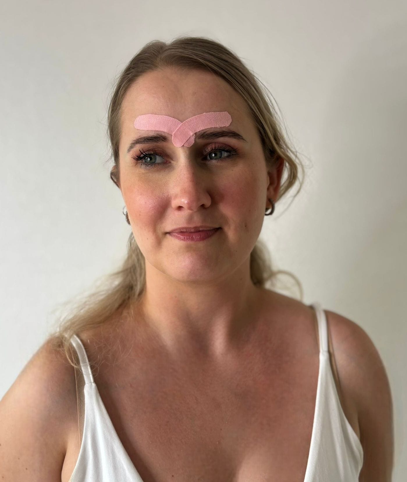 Sur peau parfaitement sèche, découpe et applique le tape sans tirer ni étirer la bande. Il doit simplement reposer sur la peau, sans créer de tension, pour un effet doux et respectueux de la structure du visage.